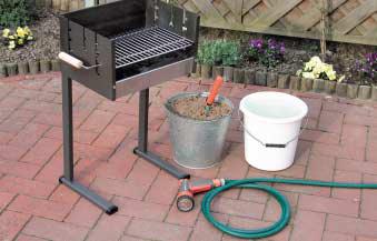 Löschmittel bereithalten. Einen Eimer Wasser, Sand oder einen Feuerlöscher bereithalten. Selbst ein bereitgelegter Gartenschlauch kann im Notfall eine nützliche Hilfe sein.