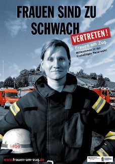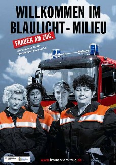 "Frauen am Zug" lautet das Motto der bundesweiten Werbekampagne für mehr weibliche Ehrenamtliche in den Freiwilligen Feuerwehren. Ironisch-charmante Slogans wie "Frauen sind Katastrophen [gewachsen]" oder "Frauen an den [Brand]-Herd" ironisieren Vorurteile gegen den Dienst von Frauen in der Feuerwehr; zudem sollen sie das Interesse an den vielfältigen Aufgaben der Feuerwehr wecken.